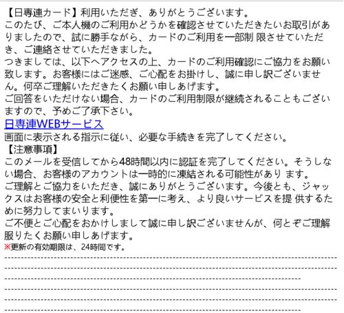 【情報】 2025/03/23 頃から、「日専連」を騙るフィッシングメールを多数受信しています。ご注意ください。 【図表】 出典: 受信ルメール 【フィッシングメールの文面】 【日専連カード】利用いただぎ、ありがとうございます。 このたび、ご本人機のご利用か…